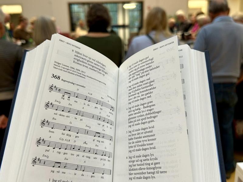 Vi synger gode sange fra Højskolesangbogen en gang om måneden.